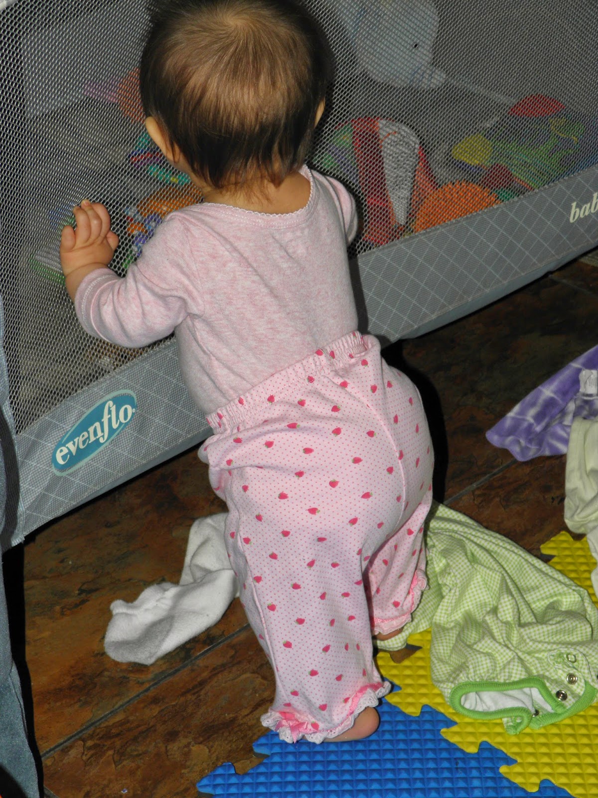 This whole "cruising" thing is quite new; just in the last week or so. In fact, the older 3 are still surprised when they see her standing. :) Other new things this month: she wants to feed herself, and has begun with baby puffs, "Baby Mum Mum's", crushed rice Chex, rice, and steamed zucchini. Rice noodles & sweet potato didn't go over well, as they are difficult to pick up.